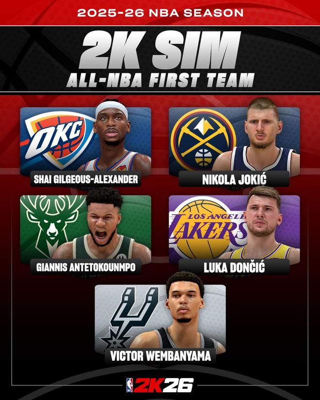 雷速体育10月18日讯 NBA 2K官方今日更新社交媒体,晒出了对新赛季最佳阵容的预测结果,以下是具体名单: